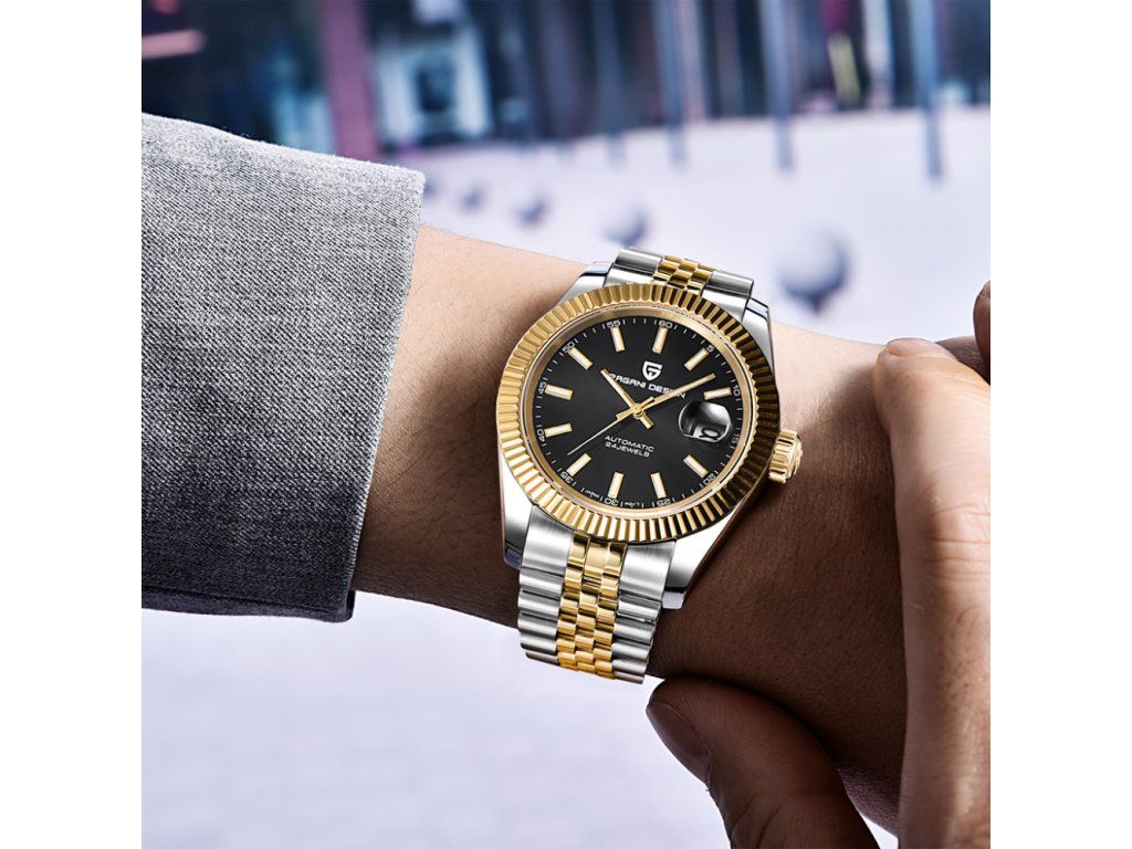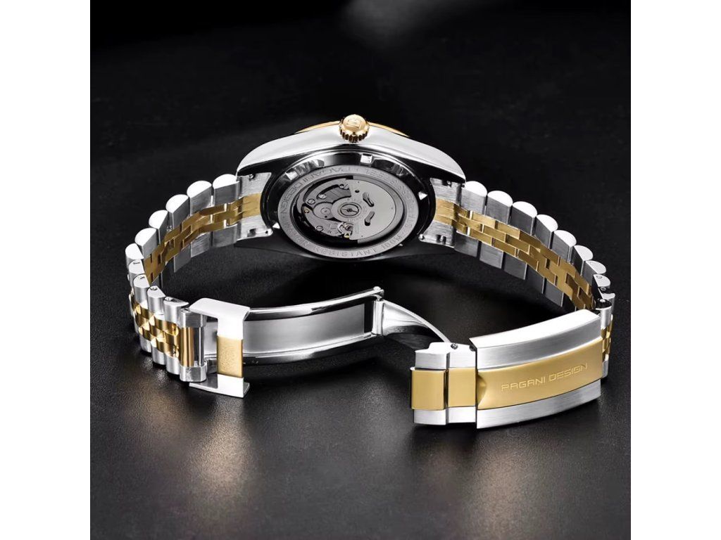 Emelje megjelenését egy új szintre a Pagani Design lenyűgöző kéttónusú automata órájával. Ez az időmérő nem csupán egy eszköz az idő mérésére, hanem egy határozott stílusnyilatkozat. A nemesacél hűvös ragyogása és az arany eleganciája olyan harmóniát alkot, amely a tárgyalóteremben és egy elegáns vacsorán is magabiztosságot sugároz.